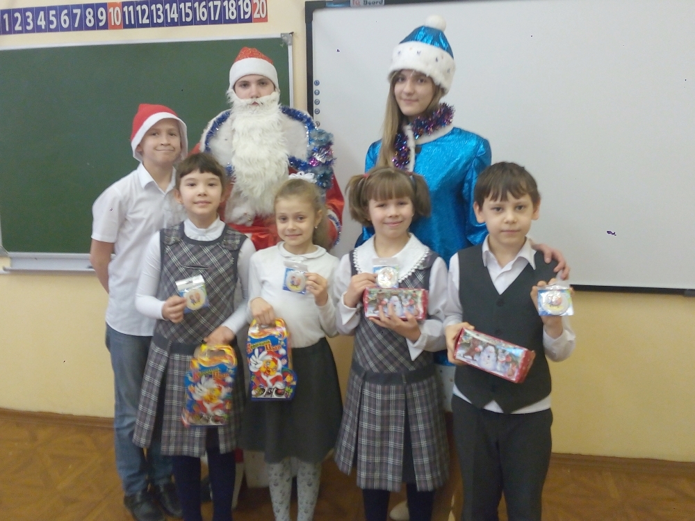 27 декабря Дед Мороз поздравлял обучающихся ГБОУ ООШ №4, которые являются победителями различных олимпиад, конкурсов, фестивалей. Вручал им сладкие подарки и световозвращающие элементы.