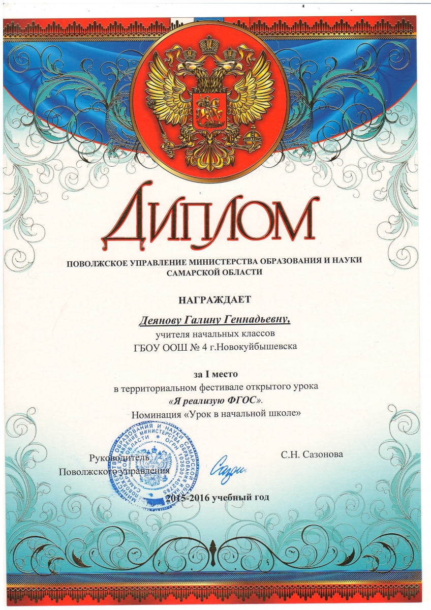 В конкурсе «Я реализую ФГОС» победителем была признана наш учитель начальных классов Деянова Галина Геннадьевна.