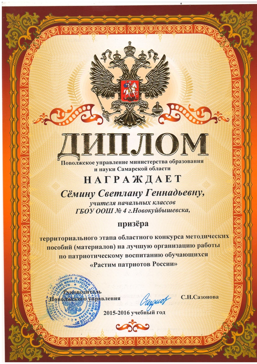 В территориальном этапе областного конкурса «Растим патриотов России» учитель начальных классов, Семина Светлана Геннадьевна, заняла третье место. Работа Светланы Геннадьевны была представлена на областном этапе данного конкурса и заняла первое место.