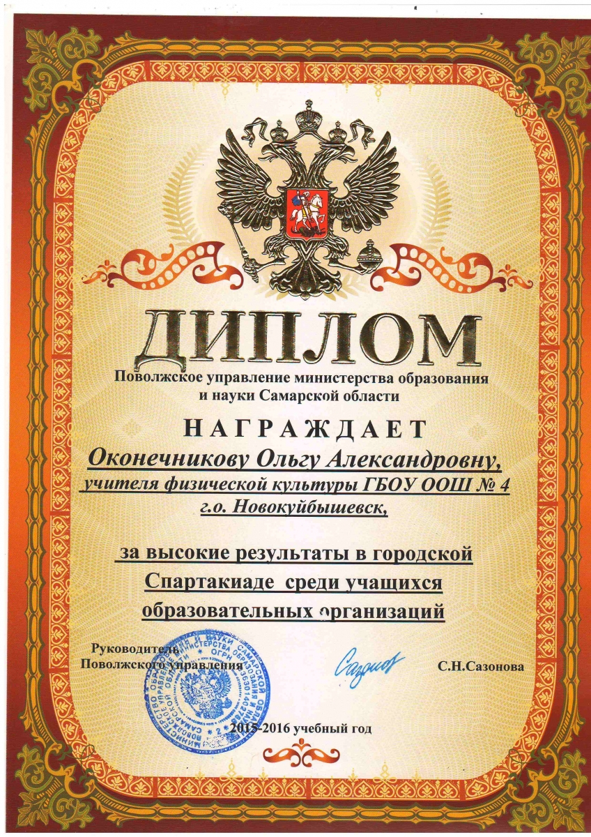 Учитель физической культуры, Оконечникова Ольга Александровна, получила диплом участника очного территориального этапа всероссийского конкурса «Учитель года».