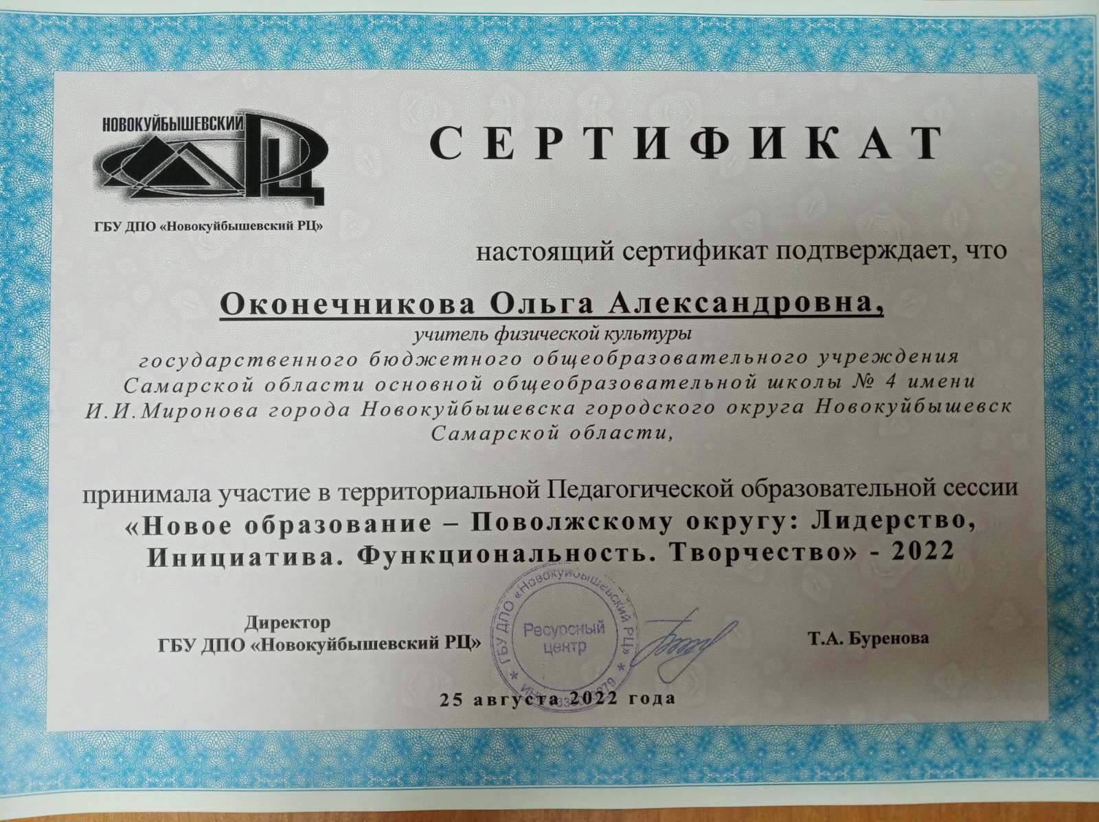 В целях распространения идей педагогического коллектива для реализации Концепции «Школа Министерства просвещения Российской Федерации» 25 августа 2022г. три педагога школы №4 приняли участие в педагогической территориальной Педагогической образовательной сессии «Новое образование — Поволжскому округу: Лидерство. Инициатива. Функциональность. Творчество»-2022. Модель сетевого взаимодействия по предпрофильной подготовке обучающихся представила Бобкова Елена Анатольевна, учитель начальных классов, эксперт регионального чемпионата «Молодые профессионалы» Самарской области в компетенции «Лабораторный химический анализ» (2019г., 2021г.), за период с 2019г. подготовила 2 призёров и 1 победителя регионального чемпионата WorldSkills Russia. Сёмина Светлана Геннадьевна, учитель начальных классов, победитель конкурса на присуждение премий лучшим учителям Самарской области за достижения в педагогической деятельности в 2022году представила педагогическому сообществу Поволжского округа опыт работы по составлению моделей технологических карт уроков и внеурочных мероприятий, которые помогает учителю в работе по развитию интеллектуальных способностей детей из семей-мигрантов. Учитель физической культуры Оконечникова Ольга Александровна, обладатель золотого знака «ГТО» 8-ой ступени, судья мероприятий Всероссийского физкультурно-спортивного комплекса «Готов к труду и обороне» в городском округе Новокуйбышевске презентовала алгоритм внедрения комплекса ГТО в образовательных организациях на примере проекта школы №4 «Проверь себя- выполни нормы ГТО».