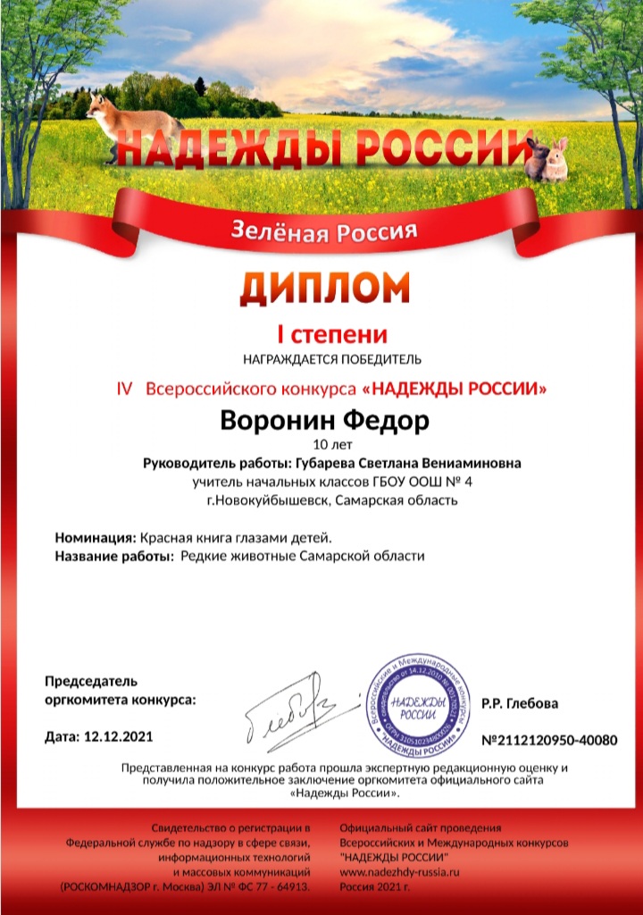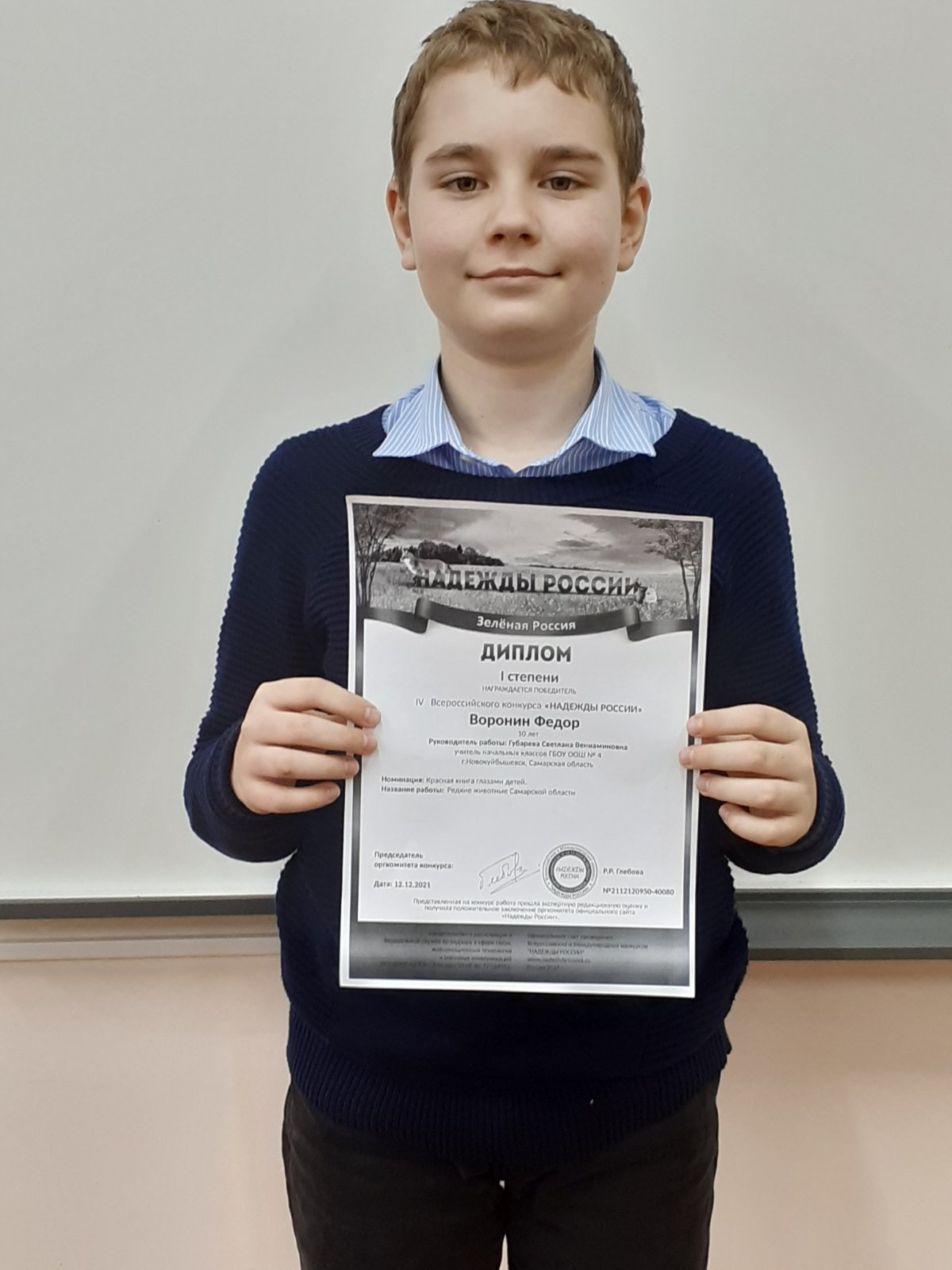 Поздравляем Воронина Федора, ученика 4б класса, и классного руководителя Губареву Светлану Вениаминовну с дипломом I степени в IV Всероссийском конкурсе «Надежды России»! Достойный результат!