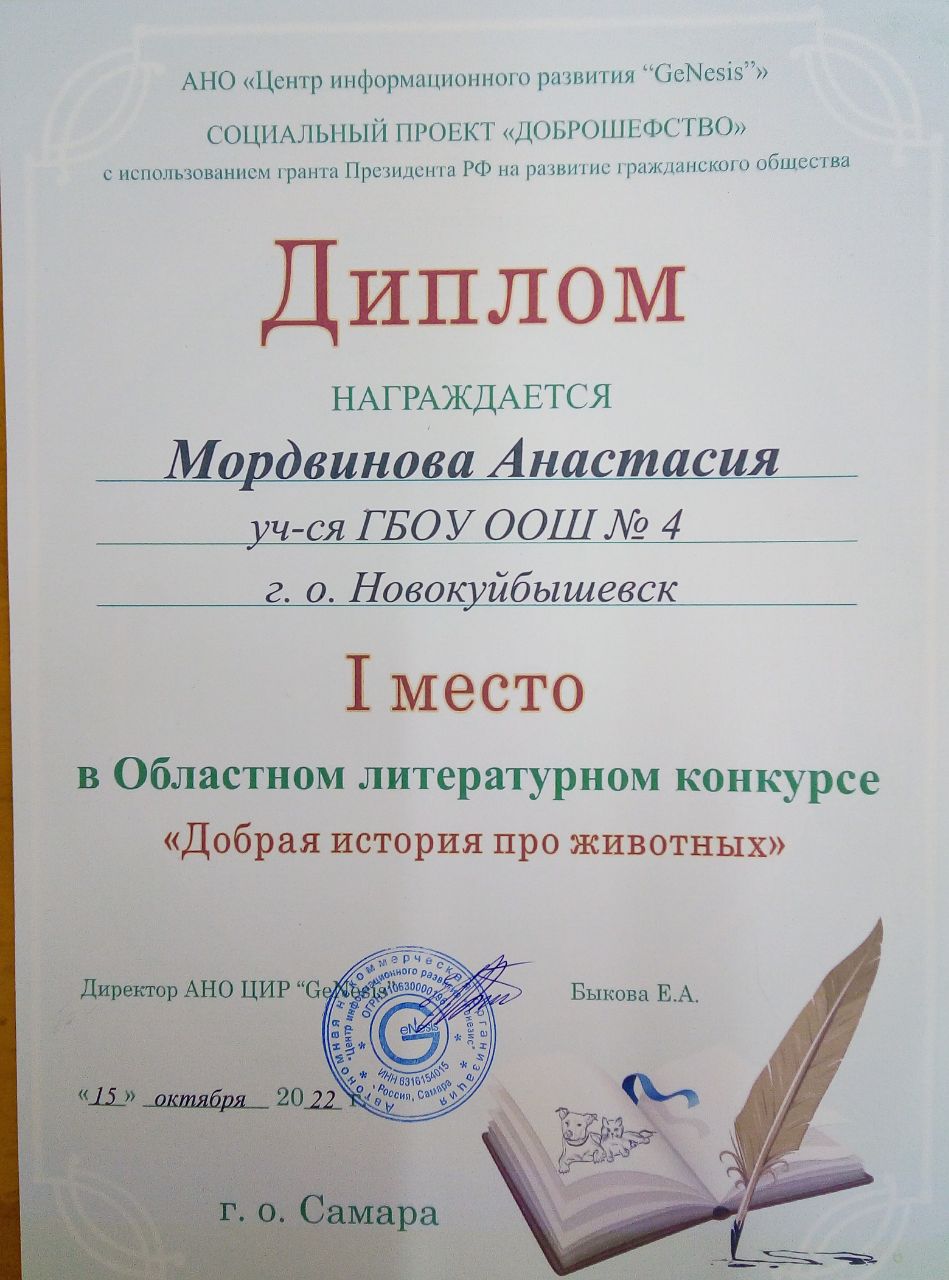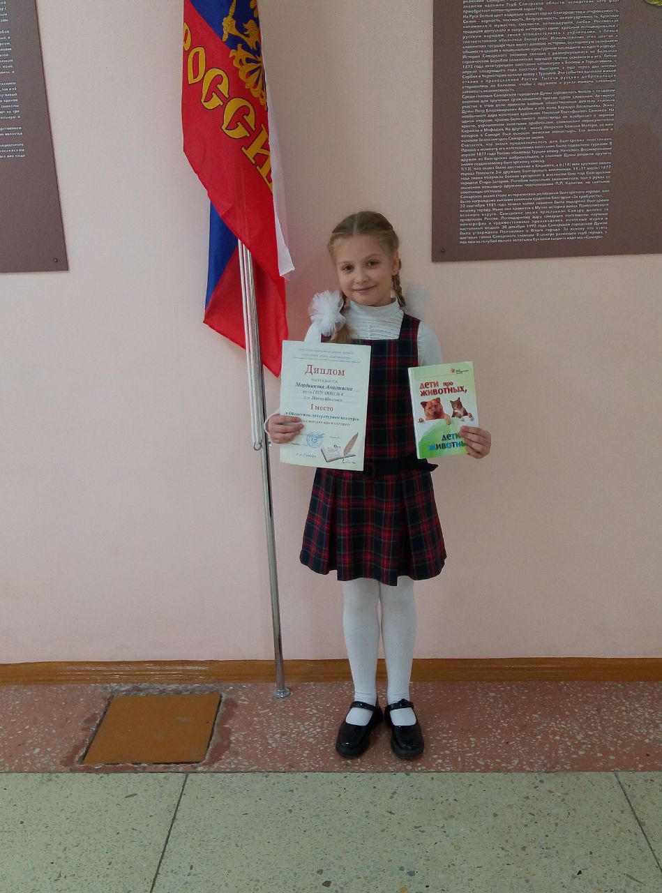 Ученица 3а класса, Мордвинова Анастасия, заняла 1 место в Областном литературном конкурсе «Добрая история про животных». Социальный проект «Доброшефство».