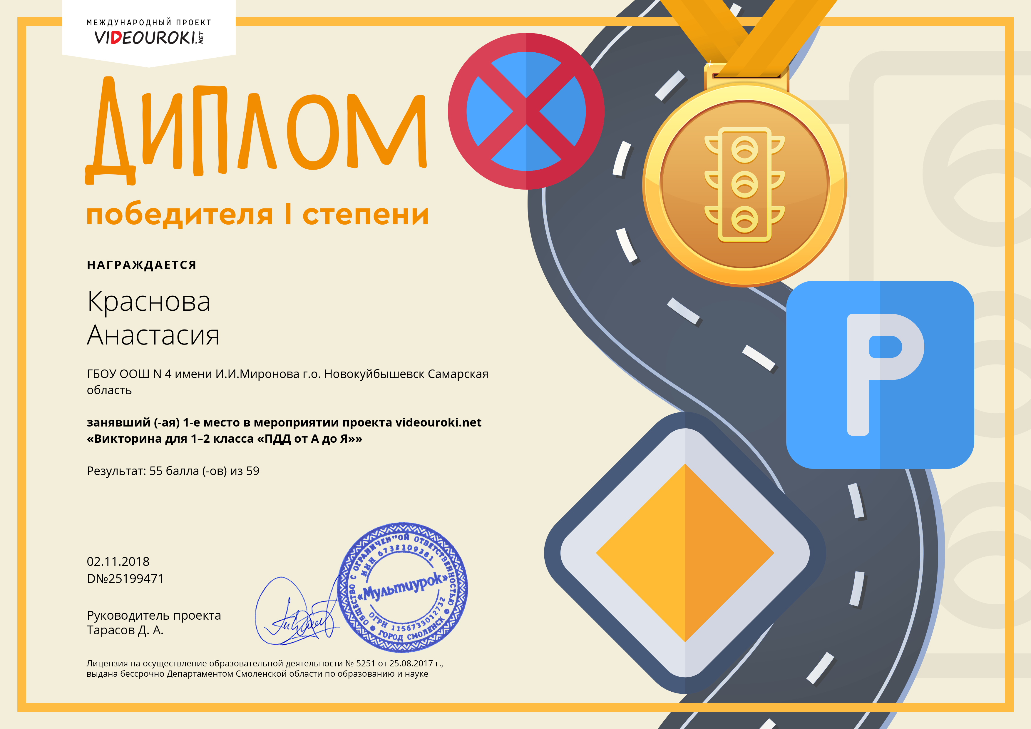 Continue reading Помни ПДД!2 ноября 2018 года ученики 1б класса приняли участие в мероприятии проекта Видеоуроки.нет «Викторина для 1-2 класса «ПДД от А до Я»». Победителями стали Краснова Анастасия и Николаева Варвара. 8 призеров, 16 человек получили сертификаты участников.