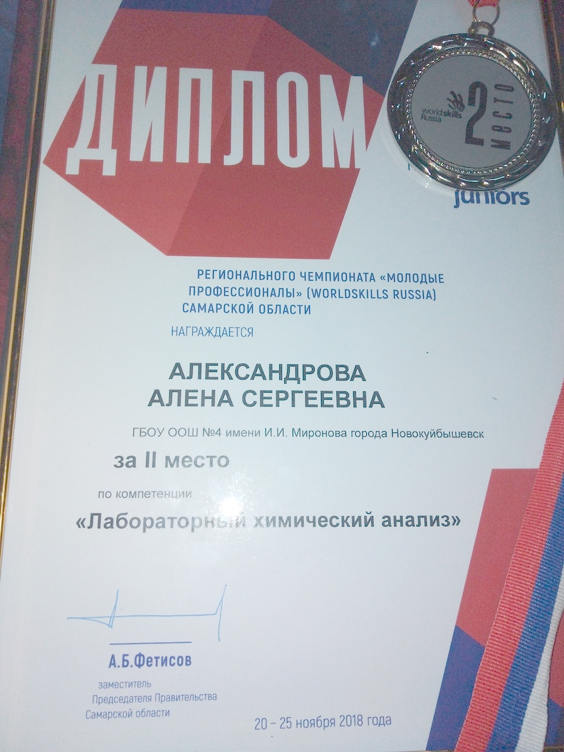 Continue reading Центр правовой информацииАлександрова Алёна, обучающаяся 9Б класса ГБОУ ООШ №4 г. Новокуйбышевска, стала призером (2-место) в региональном чемпионате «Молодые профессионалы «Worldskills Russia» в компетенции «Лабораторный химический анализ» категории Юниоры. Поздравляем!