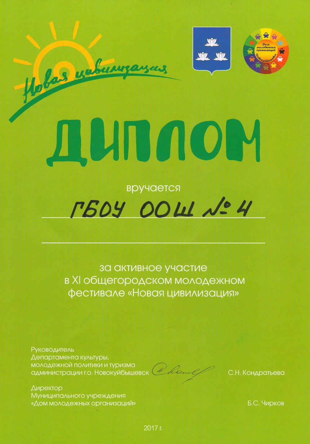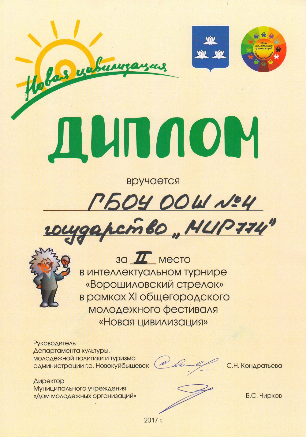 В период с 11 по 14 апреля 2017 года в МУ «Дом молодежных организаций» проходил XI общегородской молодежный фестиваль «Новая цивилизация», где наши ребята, обучающиеся 7-8 классов, заняли II место в интеллектуальном турнире «Ворошиловский стрелок». Поздравляем!